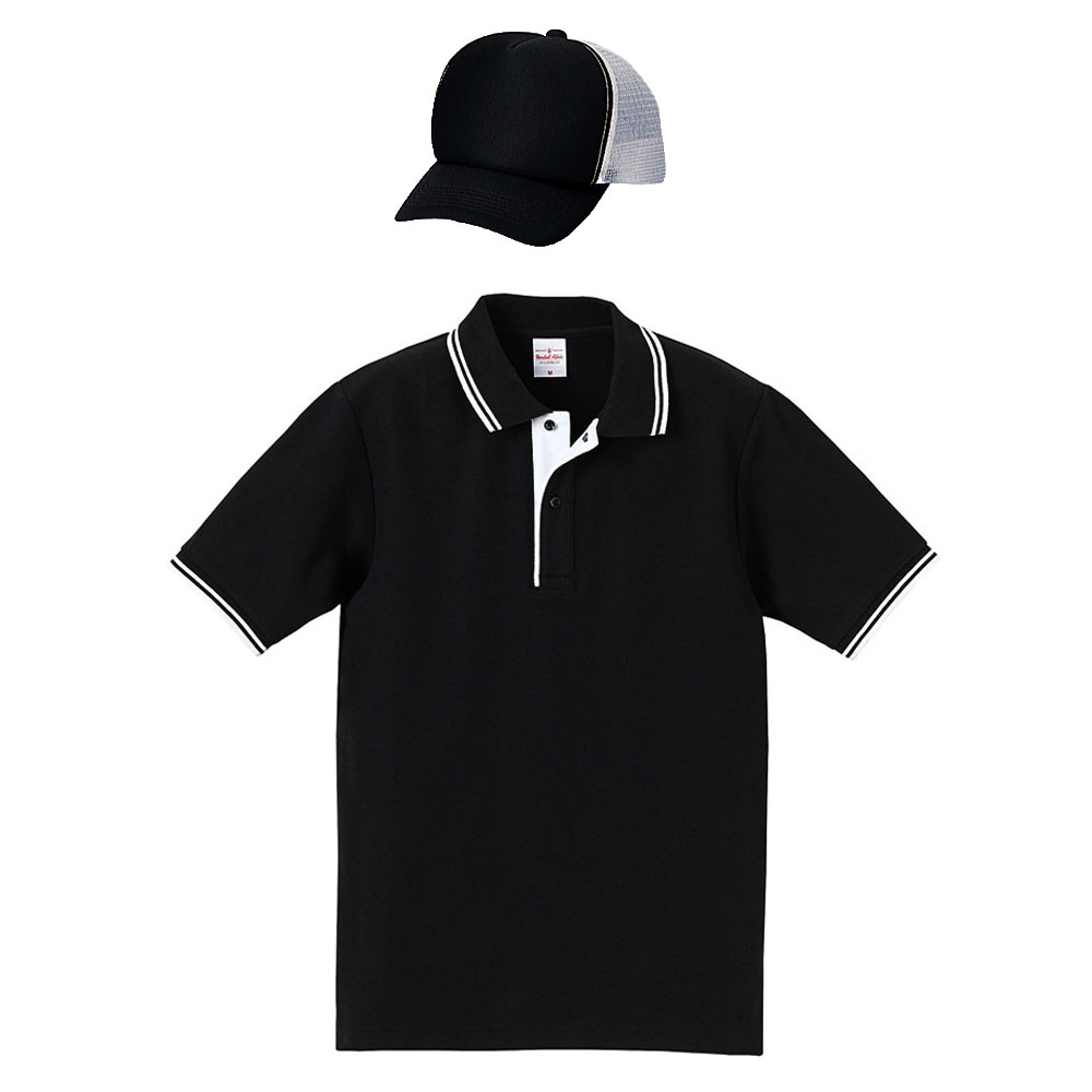 ゴルフウェア・コーデ(ポロシャツ+帽子) 6.2oz ラインポロシャツ+メッシュキャップ (ブラック・ホワイト・ホワイト+帽子(ブラック・ホワイト))