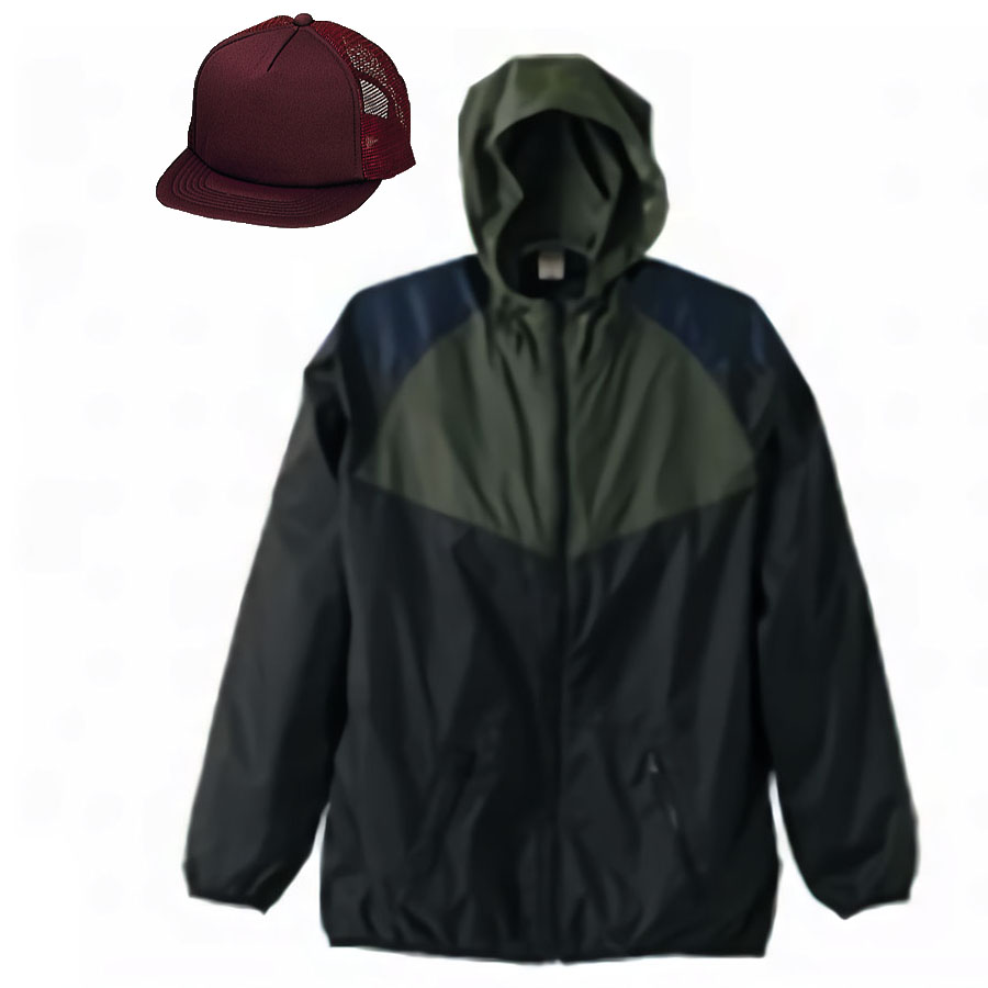 ナイロンパーカー(フード付きウィンドブレーカー)+メッシュキャップ コーディネート (オリーブ・ブラック+帽子(マロン))