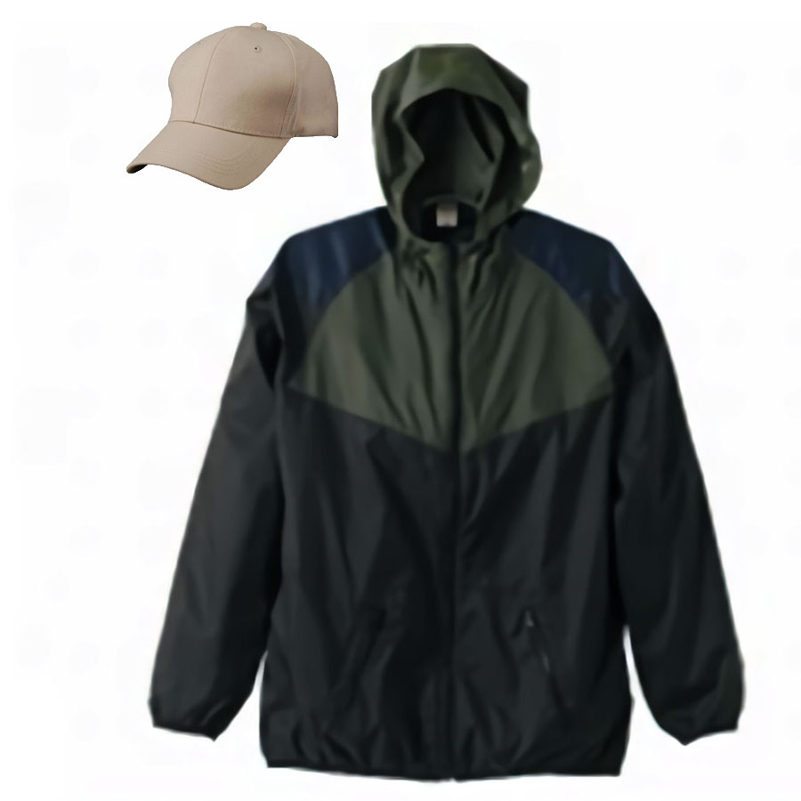 ナイロンパーカー(フード付きウィンドブレーカー)+コットンキャップ コーディネート (オリーブ・ブラック+帽子(ベージュ))