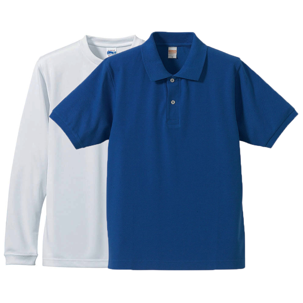 ユナイテッドアスレ ドライシルキータッチ長袖Tシャツ+半袖ポロシャツ(ロイヤルブルー)重ね着コーデ (Inner:ホワイト+Outer:ロイヤルブルー)