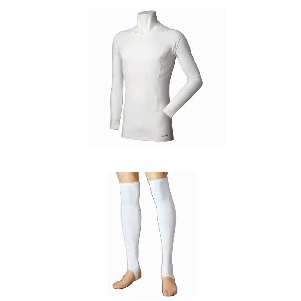 防寒(裏起毛)インナーVネックシャツ長袖+レッグサポーターセットアップ M・Lサイズ (ホワイト)
