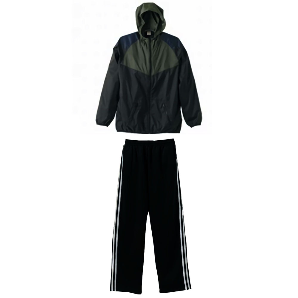 ナイロンパーカー(フード付きウィンドブレーカー)+ジャージロングパンツ上下コーデ (ブラック・シルバー(ジャージ))