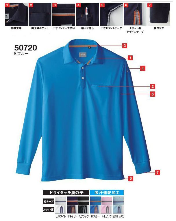 SOWA 5.2oz ドライ+デオドラント長袖鹿の子ポロシャツ 6Lサイズ