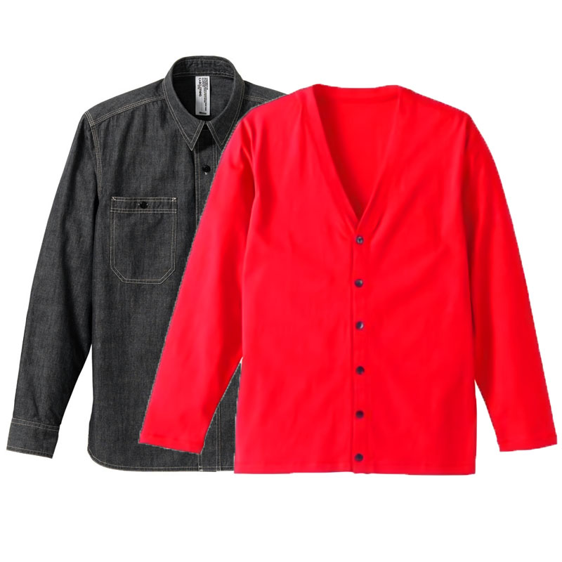コーデ・セットアップ カーディガン(ユナイテッドアスレ)+CAB長袖シャンブレーシャツ (フレンチレッド(Outer)+シャンブレーブラック(Inner))